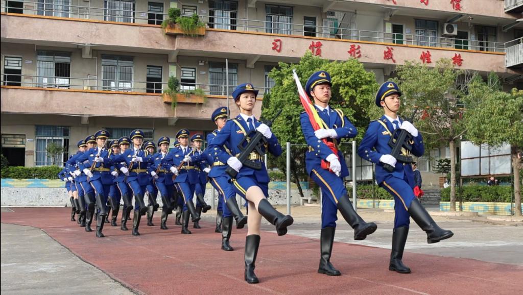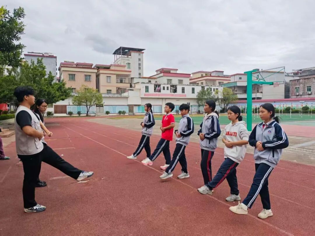 自2024年首次携手,两校国护队结下深厚情谊。2025 年9月,在双方党组织的结对衔接下,云浮校区国护队员利用课余时间轮流为中学2025级新队员开展为期两周的系统训练。从站姿、齐步、正步的基础规范,到执旗、展旗、升旗的专业流程,队员们逐一细致拆解、以身示范,手把手传授技能。夕阳下的操场,大学生的严谨专注与中学生的坚毅执着相映成辉,汗水浸透的制服里,承载着对国旗的敬畏和热爱,传递着新时代青年的责任担当。