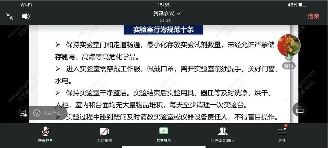 戴沩老师立足"安全第一、预防为主、综合治理"的方针,通过典型案例分析,重点围绕以下方面展开讲解:一是个人防护装备的科学选用与规范操作;二是危险化学品分类管理与应急处置;三是大型仪器设备安全使用要点;四是实验室行为规范与准入制度。宣讲内容既涵盖安全管理政策要求,又包含实用操作技能,为暑期科研工作提供了坚实的安全保障。